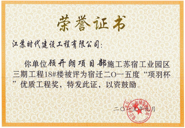 近日,蘇宿園區(qū)公舍三期18#白領(lǐng)公寓工程被宿遷市住房和城鄉(xiāng)建設(shè)局授予“項羽杯”優(yōu)質(zhì)工程獎。