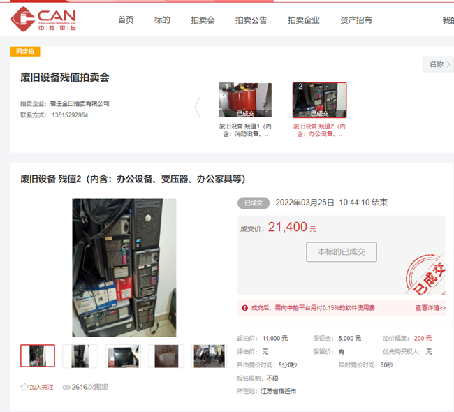 3月25日上午10時(shí)30分,開發(fā)公司一批廢舊辦公設(shè)備、辦公家具、變壓器等物資在中拍平臺公開拍賣,7家競買人,經(jīng)過14分10秒緊張激烈競價(jià),最終以21400元成交。