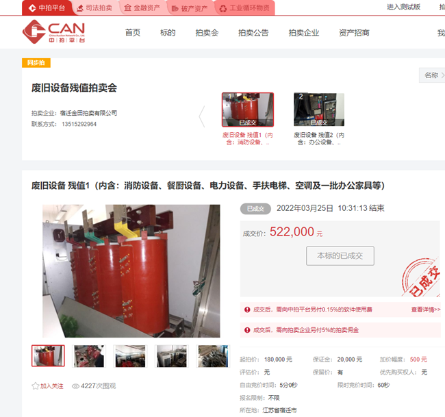3月25日上午10時(shí),城發(fā)公司一批廢舊消防設(shè)備、餐廚設(shè)備、電力設(shè)備、手扶電梯、空調(diào)等物資在中拍平臺(tái)公開拍賣,經(jīng)過30分鐘的緊張激烈競價(jià),最終以522000元成交標(biāo)的,比評(píng)估價(jià)180000元高出342000元,溢價(jià)率190%。