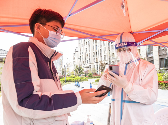 沈揚是園區(qū)城發(fā)公司財務(wù)審計部總經(jīng)理,3月29日23時,當孩子們已進入夢鄉(xiāng),他和在蘇宿鄰里公司財務(wù)部工作的妻子施桂俠先后接到疫情防控緊急集合電話,夫妻倆迅速決定將三個孩子交給70多歲患有冠心病、裝著起搏器的父親和雙腿裝著人工膝蓋的母親來照料,義無反顧地投入到疫情防控一線。沈揚是包保小區(qū)的點位長,連夜統(tǒng)計整理包保點居住人數(shù)、設(shè)計表格、領(lǐng)取防疫物資、布置點位人員,忙完這些,天已放亮,他又接著開展核酸檢測工作。檢測完成后,他又忙著統(tǒng)計分析數(shù)據(jù),優(yōu)化工作方案,申領(lǐng)第二天核酸檢測物資,又到夜里2點多,他稍瞇了會,四點多又趕到點位進行新一輪核酸檢測布置。妻子是登記員,雖然在同一個小區(qū),只有吃飯時能見上一面,相互交流一下家里的情況。已四五天沒回家的他們,只能空閑時通過視頻安撫一下兩個幼兒,鼓勵和督促一下即將中考的大女兒。