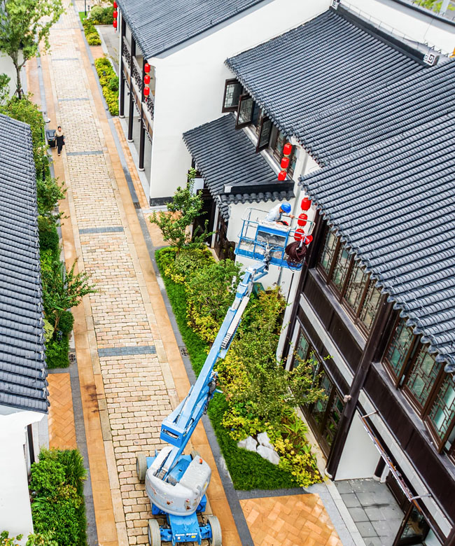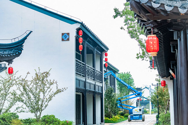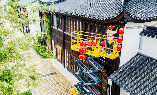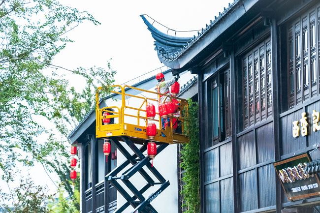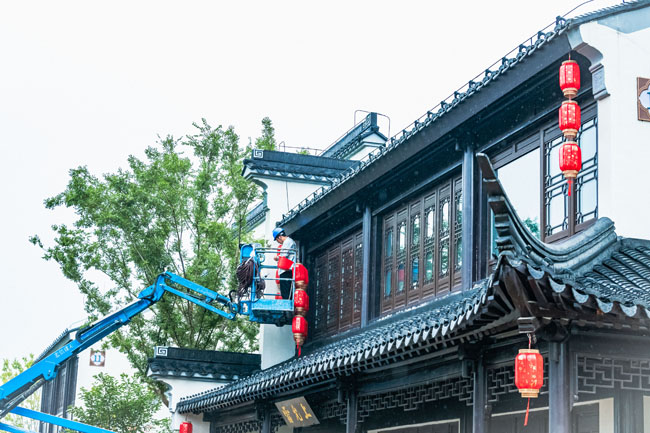 2023年9月25日,蘇宿工業(yè)園區(qū)蘇州街,工人們正在掛燈籠,喜迎中秋、國(guó)慶雙節(jié)到來(lái)。大紅燈籠與白墻青瓦綠樹相映成趣,成為一道靚麗的風(fēng)景線,營(yíng)造了歡樂(lè)、喜慶、祥和的節(jié)日氛圍。