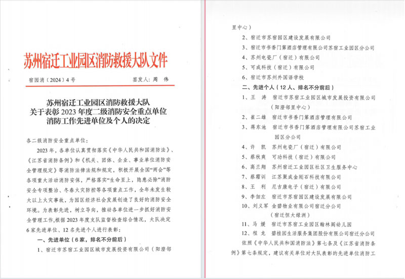 近期,陽澄鄰里中心獲評園區(qū)“2023年度消防安全管理工作先進(jìn)單位”,公司消防安全管理員王濤獲得園區(qū)“2023年度消防安全管理工作先進(jìn)個人”。