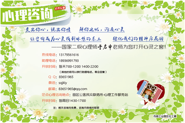 為了做實(shí)心理咨詢工作,社區(qū)通過市志愿者協(xié)會牽線,聯(lián)系到9名心理咨詢老師,組建了社區(qū)公益社團(tuán),免費(fèi)開通線上心理咨詢,為居民和職工打開一扇心理咨詢的大門。一周時間,已接收8起線上咨詢。