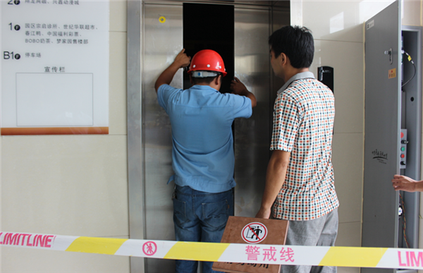 本次演練模擬在西楚金地突發(fā)的一起電梯故障困人事件而展開的應急救援。上午9時30分,兩名乘客乘坐西楚金地1號電梯升至4層時突然遭遇電梯停電,乘客緊急按動報警按鈕,語音向中控室反映電梯突然停梯,梯內(nèi)被困乘客兩名。中控室接到報警后,立即啟動電梯故障困人應急救援預案,在安撫乘客的同時,迅速通知工程維修中心及維保單位。相關人員迅速兵分兩路,一路到電梯機房準備盤車,平層施救;另一路到救援樓層4層準備手動打開廳門,營救轎廂內(nèi)被困乘客。從接到報警求助到救援結(jié)束,整個救援工作不到8分鐘即告成功。