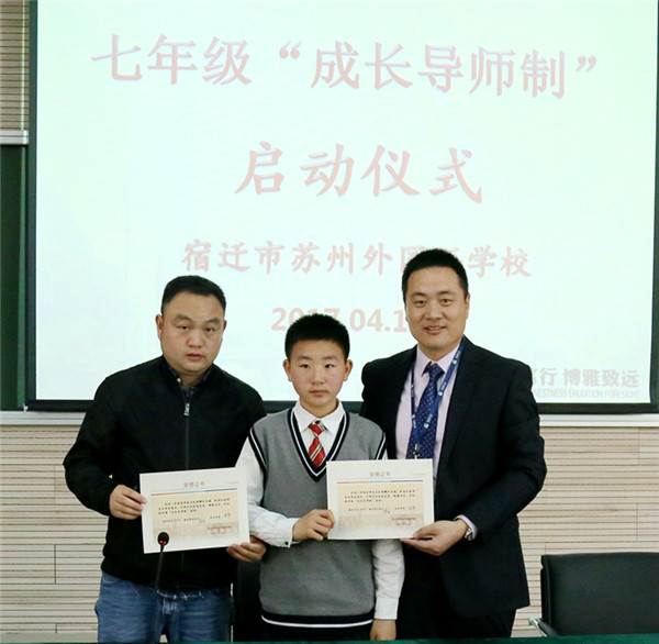 近日,宿遷市蘇州外國(guó)語學(xué)校七年級(jí)16位孩子和他們的家長(zhǎng)監(jiān)護(hù)人還有他們新認(rèn)的“干爹”“干媽”齊聚學(xué)校階梯教室,舉行隆重的簽約儀式。這些“干爹”“干媽”是學(xué)校給首批孩子們配的成長(zhǎng)導(dǎo)師,每位教師與一個(gè)孩子結(jié)對(duì),全方位關(guān)心孩子的成長(zhǎng),陪伴孩子們一起度過快樂而充實(shí)的初中生活,力求“個(gè)個(gè)進(jìn)步,人人成星”?!俺砷L(zhǎng)導(dǎo)師制”這種親情化、個(gè)性化、人本化的育人模式,是宿蘇外實(shí)施素質(zhì)教育,提升教育核心競(jìng)爭(zhēng)力的需要;是宿蘇外服務(wù)家長(zhǎng),擴(kuò)大教育品牌影響力的需要;是宿蘇外回報(bào)社會(huì),落實(shí)“兩聚一高”,建設(shè)和諧社會(huì)的需要。